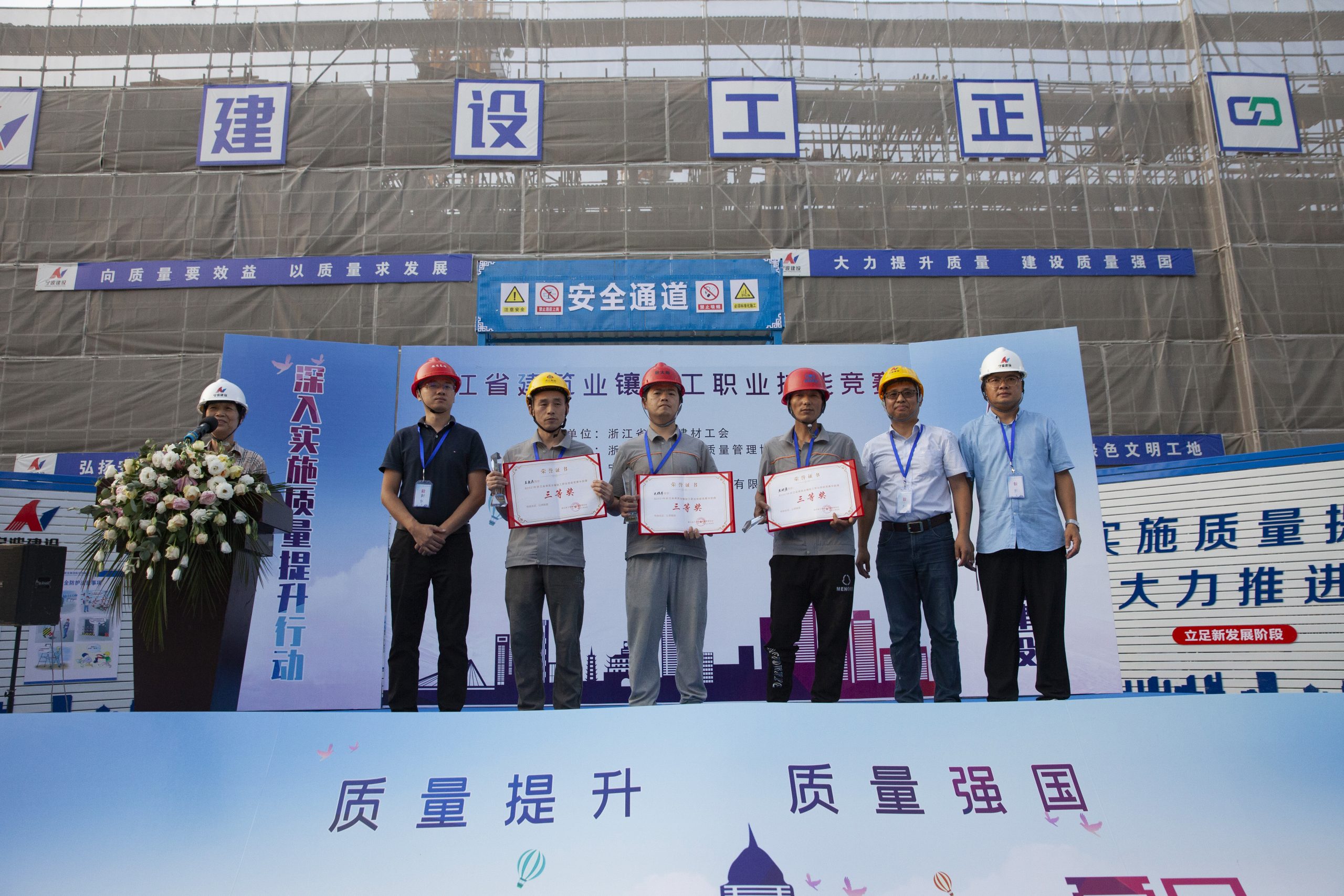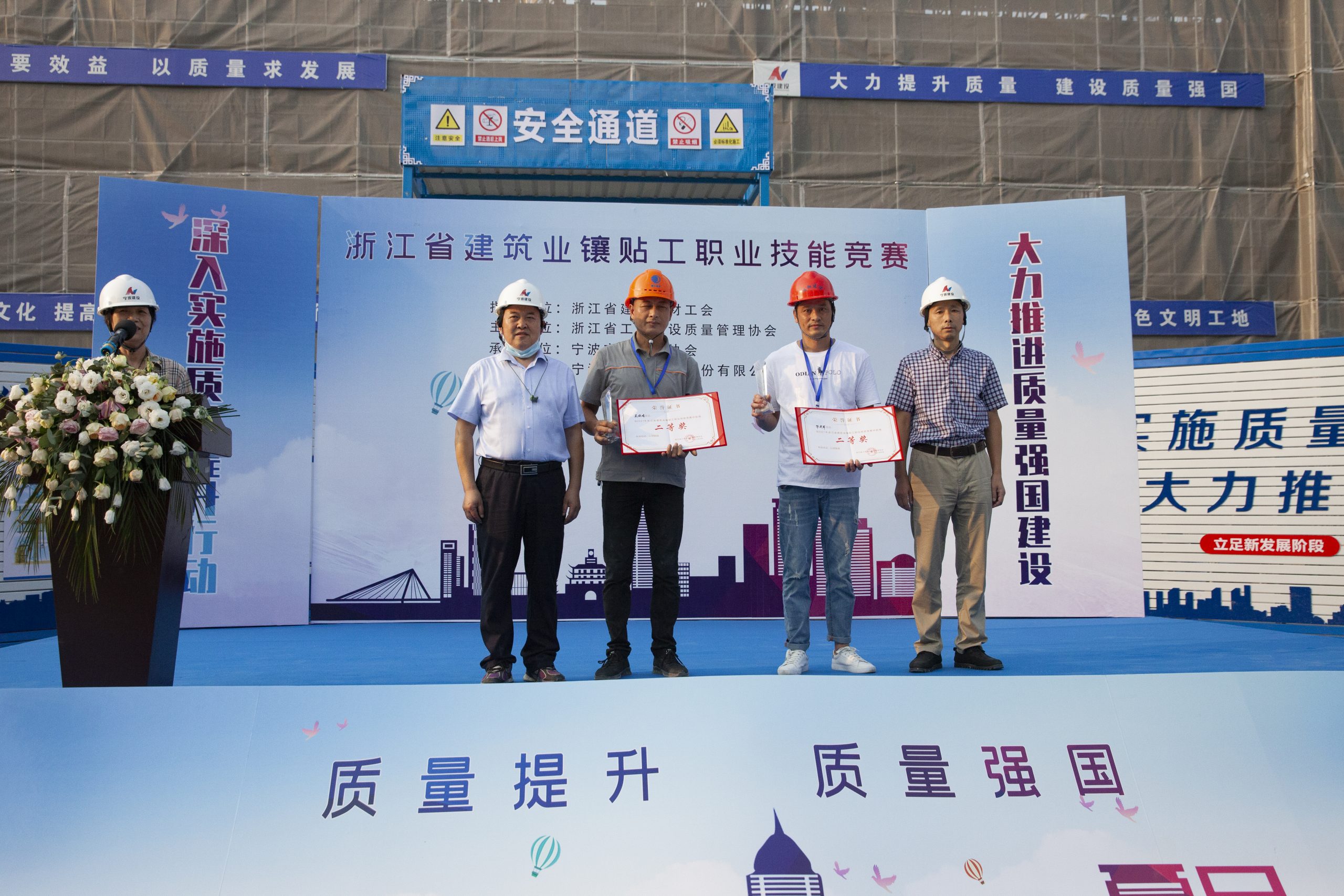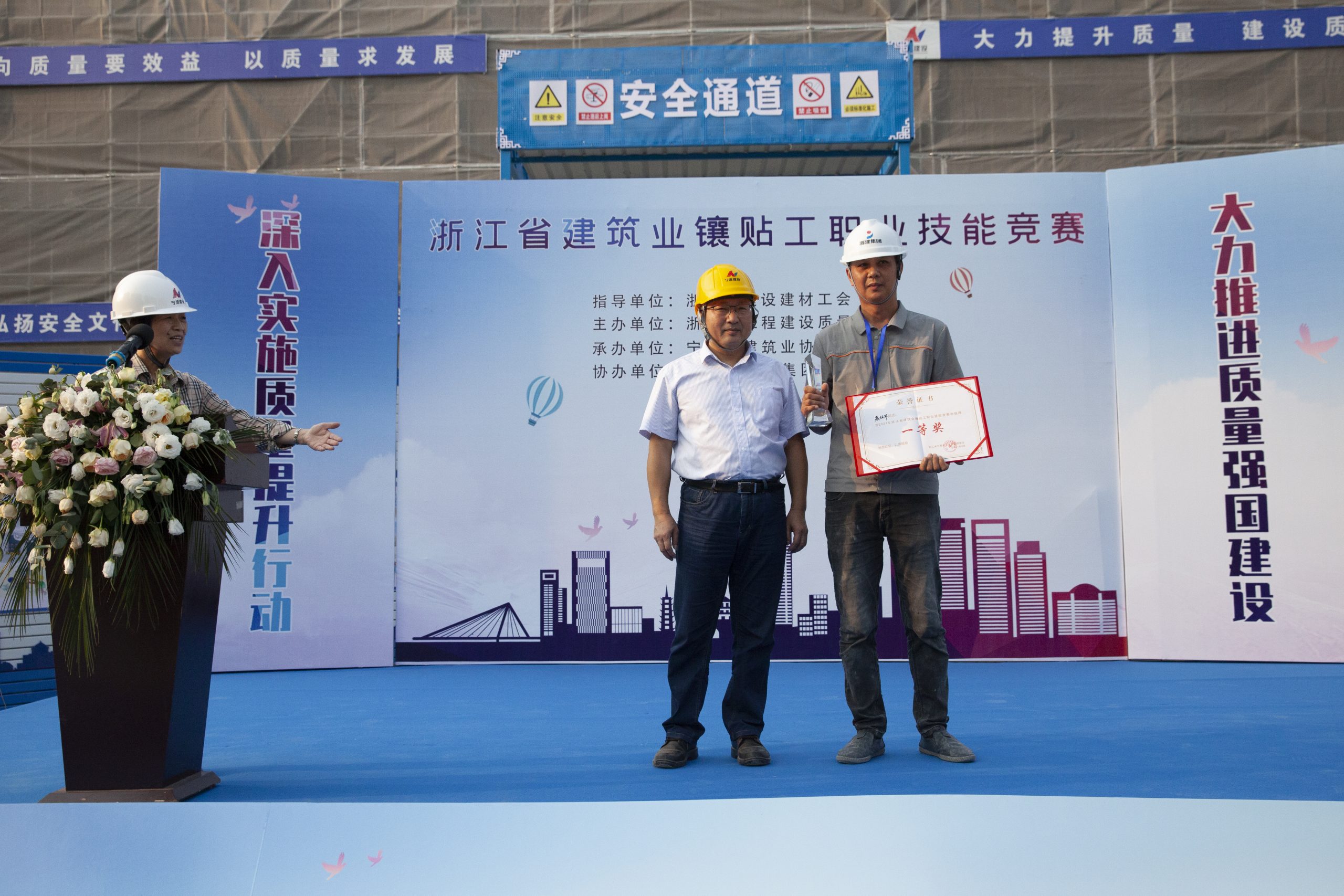 ? ? ?此外,當(dāng)天在新芝小學(xué)項(xiàng)目觀摩會(huì)現(xiàn)場(chǎng),還舉行了全省建筑業(yè)鑲貼工職業(yè)技能競(jìng)賽,共有11支鑲貼工競(jìng)賽隊(duì)伍同臺(tái)競(jìng)技,比拼瓷磚薄貼法工藝。比賽分為理論和實(shí)操兩塊,要求參賽者從施工規(guī)范、質(zhì)量要求、裝飾構(gòu)造以及對(duì)防水、防潮、防霉等處理辦法的掌握情況等方面,決出一、二、三等獎(jiǎng)。最后通過(guò)激烈角逐,省建投代表隊(duì)獲一等獎(jiǎng),寧波代表隊(duì)獲得二等獎(jiǎng)。我集團(tuán)公司董事長(zhǎng)陳繼東為獲得一等獎(jiǎng)的選手頒獎(jiǎng)。