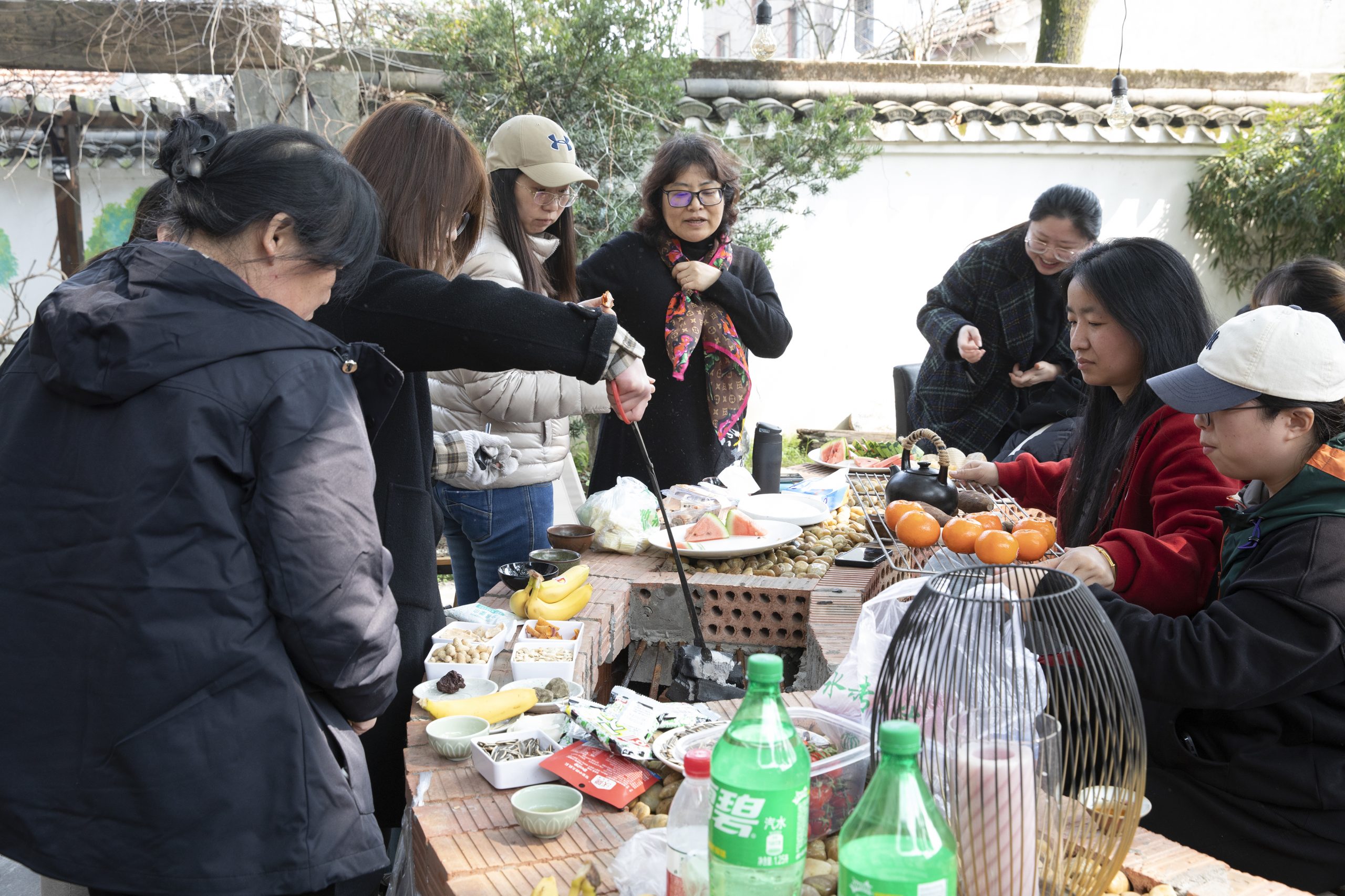 ? ? ? ?午餐后,大家在溫暖的陽光下,圍爐煮茶閑話生活。一爐炭火,一張烤架,一壺?zé)岵?,聞茶香,且喜人間好時節(jié),在爐臺上,大家煮著茶,圍在爐子旁,煮茶、烤紅薯、香蕉、桔子、板栗、花生…..圍一方天地,生一爐煙火,在圍爐煮茶,享受著春天絲絲暖意,別有一番情調(diào)。靜謐、淡然、怡情,一起細(xì)細(xì)地品味春天的味道!