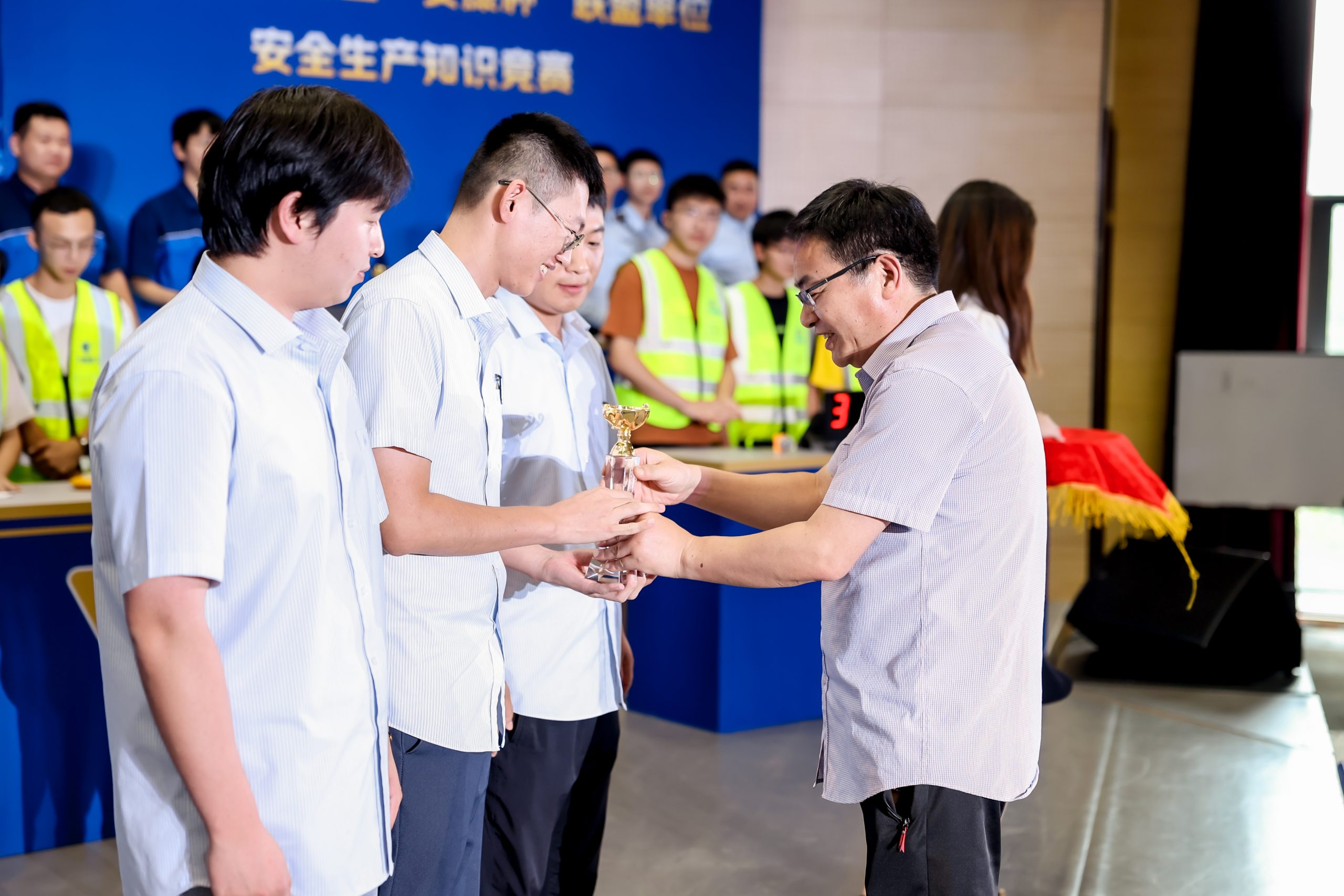 ? ? ? 經(jīng)過三輪的激烈角逐,最終由葉經(jīng)店、李盛、程文博三位隊(duì)員組成的寧波建設(shè)集團(tuán)代表隊(duì)脫穎而出,斬獲一等獎。寧冶勘、中交水利、寧波建工工程集團(tuán)榮獲二等獎,住宅集團(tuán)、寧波市政集團(tuán)、中交三航、產(chǎn)城集團(tuán)獲三等獎。寧波市海員建設(shè)工會主席楊真照為獲獎選手頒獎。