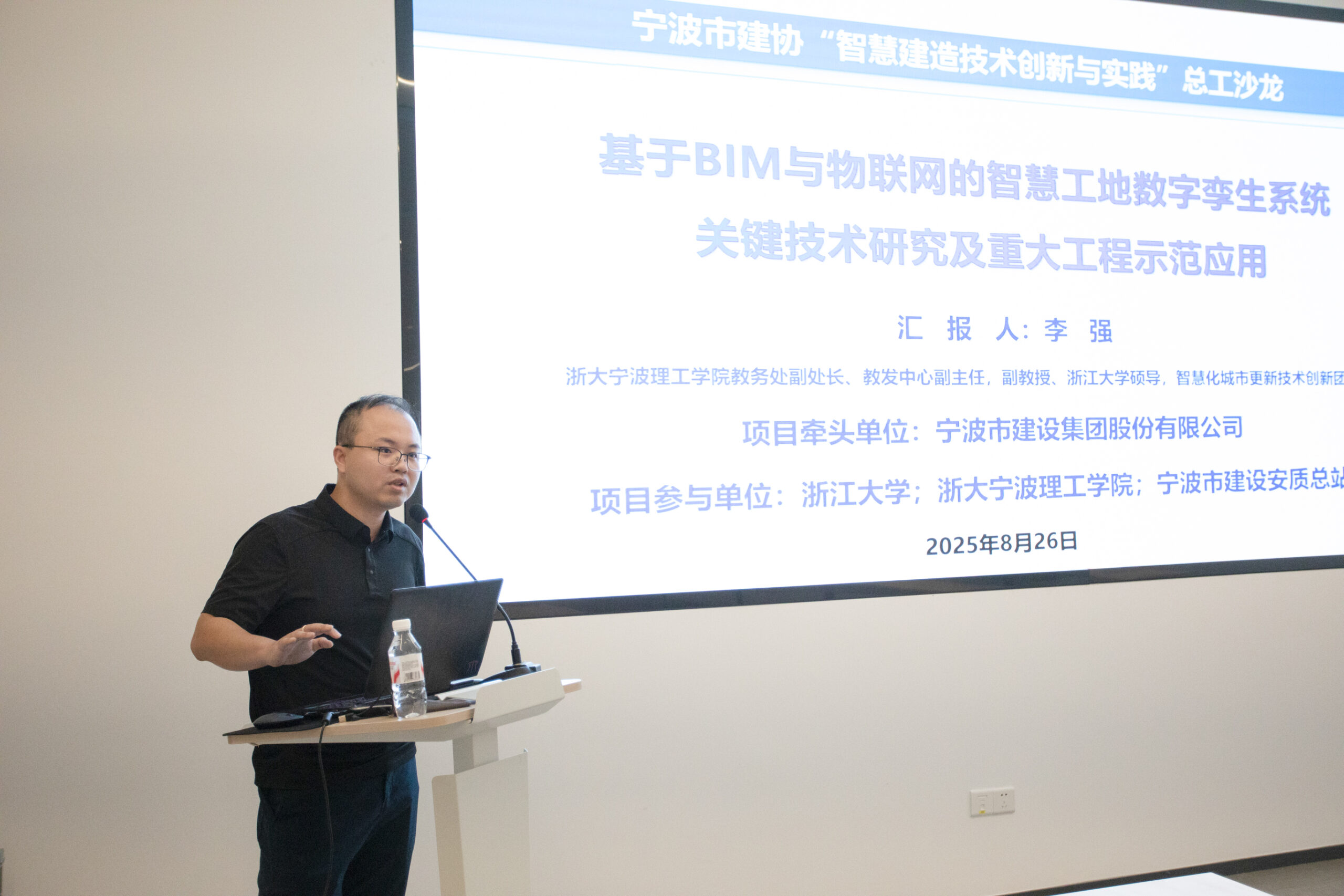 ? ? ? ?會上,浙大寧波理工學(xué)院教務(wù)處副處長李強副教授作為主講嘉賓,系統(tǒng)介紹“智慧化城市更新技術(shù)創(chuàng)新研究團隊”關(guān)于智慧工地數(shù)字孿生系統(tǒng)的前沿研究與落地實踐。他重點闡述團隊如何融合BIM模型與物聯(lián)網(wǎng)多源傳感數(shù)據(jù),攻克數(shù)據(jù)時空融合、施工全流程數(shù)據(jù)映射等關(guān)鍵技術(shù),成功構(gòu)建集智能監(jiān)測、風(fēng)險預(yù)警與可視化管控于一體的數(shù)字孿生平臺,并結(jié)合我公司承建的寧波銀行鄞州科技中心等重大工程示范案例,拆解塔吊位移監(jiān)測、地坪平整度檢測、施工風(fēng)險預(yù)警等技術(shù)應(yīng)用細節(jié),同時展望技術(shù)在復(fù)雜場景與新領(lǐng)域的拓展方向。